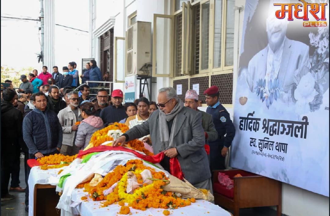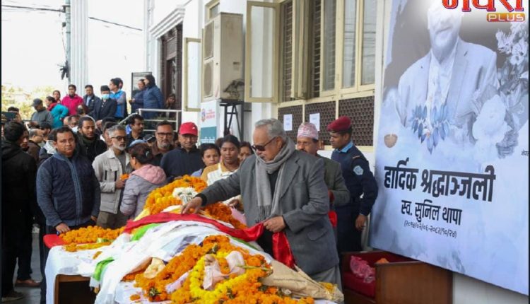 काठमाडौं । वरिष्ठ कलाकार सुनिल थापाको पार्थिव शरीरलाई चलचित्र विकास बोर्डमा राखि अन्तिम श्रद्धाञ्जली दिइएको छ । बोर्डको कार्यालयमा थापाप्रति श्रद्धाञ्जली अर्पण गर्न कलाकाहरूको बाक्लो उपस्थिति छ। उनको अन्त्येष्टि पनि आजै ९आइतबार० नै गरिने जनाइएको छ।