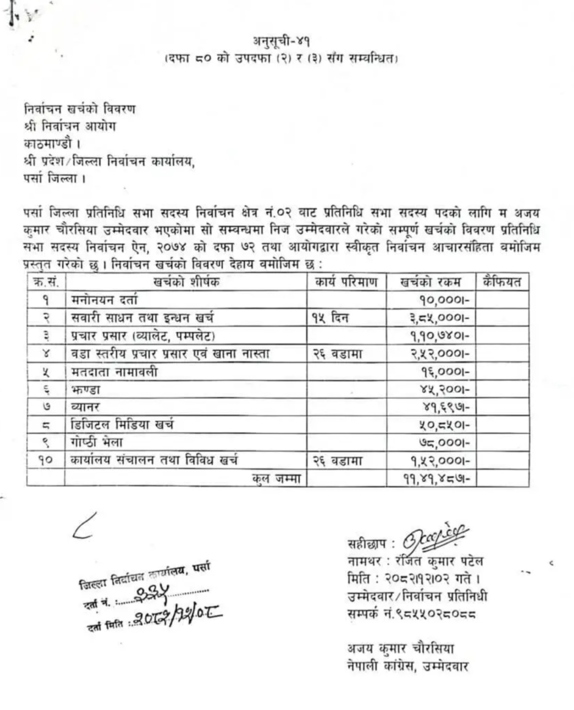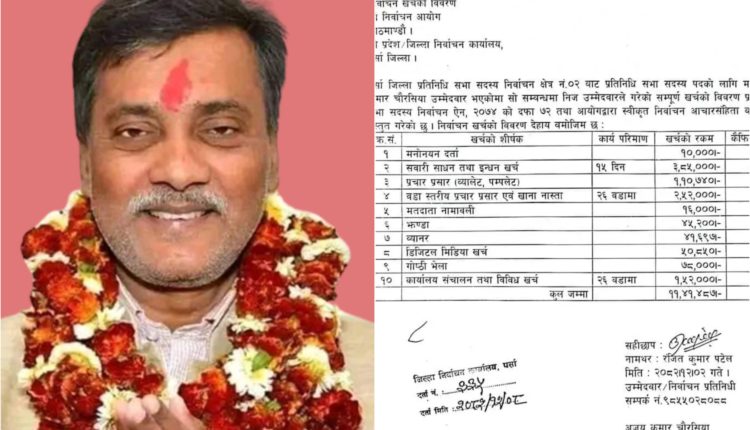 वीरगन्ज, ८ चैत । पर्सा क्षेत्र नम्बर २ मा नेपाली कांग्रेसबाट उम्मेदवार बनेर चुनाव लडेर पराजित भएका अजयकुमार चौरसियाले पनि यसपालिको निर्वाचनमा आँफुले गरेको खर्चको विवरण निर्वाचन कार्यालयमा बुझाएका छन् । आफ्ना निर्वाचन प्रतिनिधि रन्जितकुमार पटेलमार्फत पूर्वमन्त्रीसमेत रहेका चौरसियाले आँफुले निर्वाचनमा गरेको खर्चको विवरण चैत २ गते निर्वाचन कार्यालयय पर्सामा बुझाएका हुन् ।